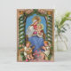 lovely vintage watercolor painting with madonna and child. the madonna is sitting on a golden coloured throne wearing a long blue and red dress, white shoulder scarf with gold stars, white headdress, crown on her head, gold halo, and holds the baby jesus in her arms, who has a golden radiating halo around his head. two infant angels sit in front and one is playing the mandolin, the other is playing a small trumpet, and both are wearing white dresses with gold trimmings, at the madonna's feet and around the angels are pink roses on the ground, and two classical columns with green flora entwining around them and archway framing the madonna and child. christian vintage painting in in pinks and blues.