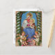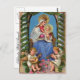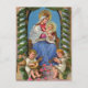 lovely vintage watercolor painting with madonna and child. the madonna is sitting on a golden coloured throne wearing a long blue and red dress, white shoulder scarf with gold stars, white headdress, crown on her head, gold halo, and holds the baby jesus in her arms, who has a golden radiating halo around his head. two infant angels sit in front and one is playing the mandolin, the other is playing a small trumpet, and both are wearing white dresses with gold trimmings, at the madonna's feet and around the angels are pink roses on the ground, and two classical columns with green flora entwining around them and archway framing the madonna and child. christian vintage painting in in pinks and blues.