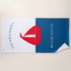Stunning nautical red white and blue beach towel featuring a red boat on a white and blue colorblock background , with a two text templates where you can add your family name and boat house , summer home or even cottage , very easy to personalise and make it your own.