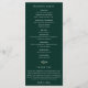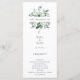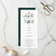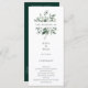 Elegant watercolor greenery frame, wedding program. Template text lists for ceremony order of events, wedding party and thank you note. Backing colour shown in dark forest green, can be customised.