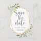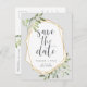Beautiful green and gold wedding save the date postcards feature gray lettering framed by a faux gold geometric border and light green watercolor foliage, leaves, and white berries on a pastel gray background. Personalize with your names, wedding date, and location, and add any additional information, like your wedding website, to the reverse side. A modern choice in a natural color scheme for boho, woodland, or nature themed weddings in any season.