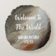 This gender-neutral baby nursery pillow is a unique way to add a personalised touch of nature to your baby's room. A grey and brown feather photo is featured on both sides of this round throw pillow. "Welcome To The World" and the baby's name and birth date appear on the front. Quickly and easily personalise.