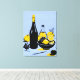 A minimalist yet captivating still life illustration that combines simplicity with vibrancy. The composition features a harmonious arrangement of objects: a wine bottle, a carafe, a fruit bowl, and scattered fruits. The palette is striking, with deep blacks, warm yellows, and a serene blue background creating a bold contrast. The crisp lines and minimal details highlight the essence of each object, evoking a sense of elegance and sophistication. This artwork celebrates the beauty of everyday objects through a modern and stylish lens, perfect for adding a touch of refined charm to any space