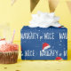 White NAUGHTY or NICE text with snowflakes and Santa Claus caps on blue background.