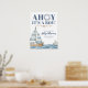 Welcome guests to your nautical-themed baby shower with this charming sign featuring a classic blue and white sailboat in the middle of a blue ocean, complete with a seagull perched on a rock. A blue life ring, blue water, and rope details add to the maritime charm.