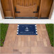 A navy and white striped welcome mat tailored to the proud beach house owner. It features a nautical Anchor followed by the family name above and est date and location below.