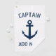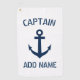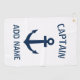 Nautical anchor custom boat captain name golf towel. Funny retirement gift ideas. Personalised presents for him or her. Custom golfing gifts for men and women. Vintage typography template for humourous quote. Fun golfing gift ideas for golfer, husband, dad, father, friend, co worker, boss, colleague, coach, instructor, trainer, teacher, grandpa, sailor, retired person, golf lover, retiree, pensioner etc. Add your own text or funny saying. Including hook to hang it up. Unique golf accessories for friends and family. White or custom colour background.