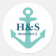 Nautical anchor custom name wedding favour stickers. Personalise with name initials and date of marriage. Teal blue or custom colour boat anchor. Great for couple, sailor, boat captain, skipper etc.