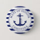 This coastal inspired nautical maid of honour button features a detailed navy blue anchor with rope and the words "Mate of Honour" above and name below in curved typography which may be personalised. The circular design is framed by a rope border against a background of navy blue and white stripes. Fun gift for your bachelorette party.