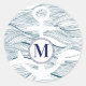 A white anchor sits atop a navy wave pattern. A white and navy nautical rope frame circles your initial.