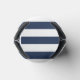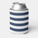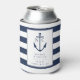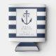 Commemorate your wedding in preppy nautical style with these monogrammed wedding favor can coolers, featuring a ship's anchor illustration in navy blue flanked by your initials. Personalize with the couple's names, wedding date and location. A navy and white striped background finishes this design for a summery nautical look.