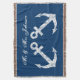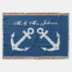 Nautical anchor mr and mrs throw blanket | Blue. Cute wedding gift idea for newly weds / bride and groom / husband and wife couple. Personalised text and customisable navy blue background colour. Vintage weathered look boat anchors. Also cosy beach home decor for sailors and sailing enthousiasts.