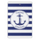 This nautical design features an anchor in the centre with a circular rope border. The word "Captain" is above and below is a name for you to personalise. Background is navy blue and white stripes.
