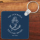 A navy blue nautical keychain with an anchor, and the words "welcome aboard" with your family name and established date. Cute accent for your boat. Designed for you by Blackberry Boulevard.