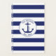 This nautical planner has a navy blue anchor with a circular rope border. Personalise with your own family name and year of establishment, or replace with other text. Background is navy blue and white stripes.
