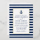 Modern Elegant Nautical Anchor Wedding Invitation. White Anchor with Gold Foil Ring around it. Navy Blue and White Stripes. Gold Foil Frame.
