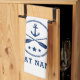 Custom Nautical Anchor with Oars - Paddle and Stars and Your Personalised Boat Name in Navy Blue on a White Kitchen Towel with Anchor-Rope Stripes.