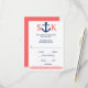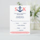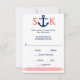 A nautical themed wedding invitation response card in navy and coral. An anchor is at the top of the invitation, with the bride and groom's initials on either side. At the bottom is a coral coloured braided rope design. The back is a solid coral with a navy anchor in the corner.