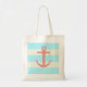 This nautical tote bag features a pink anchor on an striped aqua background. Customise this design with your name or monogram!