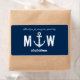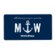 Custom navy blue and white nautical anchor wedding water bottle labels. Personalised elegant waterbottle sticker template with boat / ship anchor design. Stylish script typography for names of bride and groom and thank you message. Use as classy table decoration or thank you favour for guests at the wedding / bridal party. Logo includes name or monogram plus date of marriage. Classy design with customisable background colour. Perfect for destination weddings. Also great as wine label. Thank you for joining our special day. Maritime beach theme. Vintage style. Distressed look anchors aweigh icon.