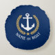 Personalise your home with round throw pillows displaying your boat name, family name or other desired text. Featuring a custom designed nautical boat anchor, gold style laurel leaves and star emblem on navy blue or easily adjust the primary colour to match your current theme. Perfect for your sailboat, beach house, lake house or RV.