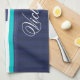 Nautical kitchen towerl with turquoise & navy blue striped pattern and customisable text.