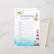 Baby Word Scramble nautical baby shower quiz game sheet. The design features a lighthouse with sailor seagull and starfish on the rocks; an anchor, the ocean and the sun wearing a captains hat looking through a telescope. Scramble is lettered in decorative text and the design has a general colour story of blue, red and white. If you would like matching products, please browse my Ahoy it's a Boy collection or message me to add the design templates you need.
