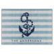 Design features a rope and anchor illustration in classic navy blue on a light blue and white stripe background. Personalise with a name or text of your choice. Great housewarming, beach house or boat gift! Coordinating accessories available in our shop.