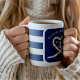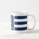 Nautical blue and white striped wedding mug. Great for a Navy (military) or lake house wedding. Design features a heart shaped rope with anchor and couple initials in the middle. Personalise it with your wedding details.