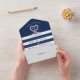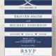 Nautical blue and white all in one wedding invitation. Great for a Navy (military) or lake house wedding. Design features stripes and a heart shaped rope with anchor and couple initials in the middle. Personalise it with your wedding details and send to all of your family and friends.