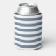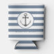 Nautical theme, blue and white striped with anchor personalised can coolers for the sailor in the family- Centred is a faux metallic, silver ship anchor in a white circle with blue border. With nautical blue and white striped pattern background. Bottom displays name of boat in matching blue letters or add your own message. Fun nautical can coolers for the summer, for beach house, for a family beach vacation, retirement gift, or vacation cruise souvenir. Cute beach wedding favours, too. We have MATCHING NAUTICAL ANCHOR AND GIFTS, as well as more nautical theme event supplies in our Zazzle.com/angela65 shop.