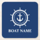 Nautical Boat Name Anchor Rope Helm Navy Blue Square Paper Coaster