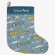 This unique nautical themed Christmas stocking features a bird's eye view nautical pattern of seafaring vessels on a blue background - the pattern includes 3 cargo ships, a sailboat, a cruise ship, a paddle wheel tour boat, a yacht and a fishing boat - name can be personalised - On the River © katz_d_zynes 2019