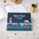This cute and fun guest book features a nautical sailor boy bear on a wooden deck with a seagull and a crab. In the background there is a red and white lighthouse, a cute bird on a sailboat, ocean waves and a navy blue starry night sky. The text combines bold and serif fonts for a stylish and modern look. This is perfect for a nautical themed baby shower.