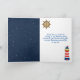 This cute and fun thank you card features a nautical sailor boy bear on a wooden deck with a seagull and a crab. In the background there is a red and white lighthouse, a cute bird on a sailboat, ocean waves and a navy blue starry night sky. The text combines bold and serif fonts for a stylish and modern look. This is perfect for a nautical themed birthday party.