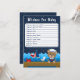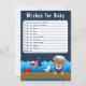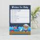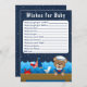 This cute and fun wishes for baby card features a nautical sailor boy bear on a wooden deck with a seagull and a crab. In the background there is a cute red bird on a sailboat, ocean waves and a navy blue starry night sky. The text combines bold and serif fonts for a stylish and modern look. This is perfect for a nautical themed baby shower.