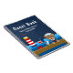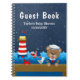 This cute and fun guest book features a nautical sailor boy bear on a wooden deck with a seagull and a crab. In the background there is a red and white lighthouse, a cute bird on a sailboat, ocean waves and a navy blue starry night sky. The text combines bold and serif fonts for a stylish and modern look. This is perfect for a nautical themed baby shower.