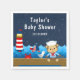 This cute and fun napkin features a nautical sailor boy monkey on a wooden deck with a seagull and a crab. In the background there is a red and white lighthouse, a cute bird on a sailboat, ocean waves and a navy blue starry night sky. The text combines bold and serif fonts for a stylish and modern look. This is perfect for a nautical themed baby shower.