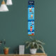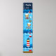 This cute and fun height chart features nautical sailor boy monkeys, a sailboat, seagull, ship wheel, bird, crab and a red and white lighthouse. In the background there are ocean waves and a navy blue starry night sky.