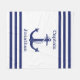 The nautical design on this blanket has a navy blue anchor in the centre with the word "Captain" above along with a name for you to personalise below and bordered by three navy blue and white horizontal stripes on each end. Great gift for a father, uncle, brother or friend who loves sailing.