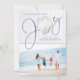 Nautical Christmas Joy Seashell Holiday Photo featuring a rustic seashell as the "o" in Joy on a background of coastal white wood, with seaside blue text. Easy to add your photo and details for a fun Christmas card!