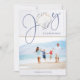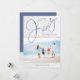 This Coastal, Nautical Christmas Joy Seashell Holiday Photo features a rustic seashell as the "o" in Joy on a background of coastal white wood, with seaside blue text. Easy to add your photo and details for a fun Christmas card!