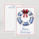 These cute coastal inspired note cards feature a nautical blue and white life preserver wreath decorated with a red bow and Christmas lights. Personalise with your choice of special holiday text on the front and back.