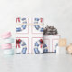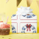 This cute coastal inspired gift wrap features a nautical blue and white life preserver wreath decorated with a red bow and Christmas lights.