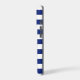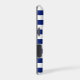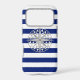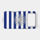 A silver chrome like applique on a navy blue style stripes print decor for a perfect nautical look.