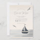 Set sail on the journey of a lifetime with this enchanting sailboat wedding invitation, gracefully navigating through serene nautical stripes in shades of bluish-grey. Embrace the timeless allure of maritime romance as you embark on your voyage together.