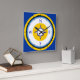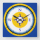 A wall clock with art of a compass in white, blue and gold on a deep blue background. The directions are in blue.
