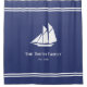 A white sailboat is in the centre of a dark blue shower curtain. Under the boat, there are two lines for your custom text. The text is white. All text can be edited or deleted.