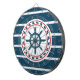 Nautical design with sailing wheel decoration in round shape on blue and white striped background