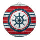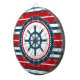 Nautical design with sailing wheel decoration in round shape on red, blue and white striped background